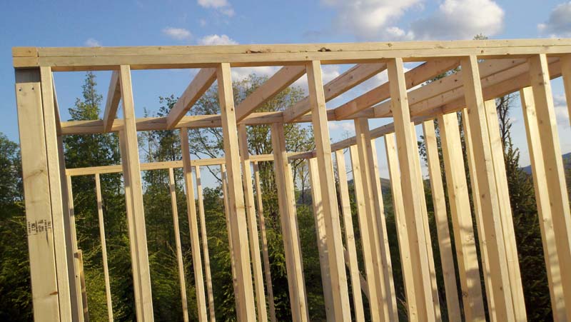5/6/11: The control room will be insulated, so I had to frame up some ceiling joists. Doing this alone was an interesting task. I created a couple extra hands to hold things in place so I could pound some nails (these were toe-nailed in from the sides).