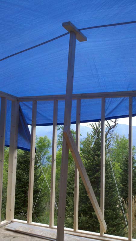 5/8/11: To keep water from pooling up on the tarp in the open area over the observatory, I built this little contraption and braced it against one wall to keep it from falling over. You can never have too much scrap lumber.